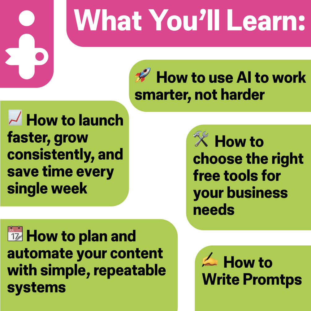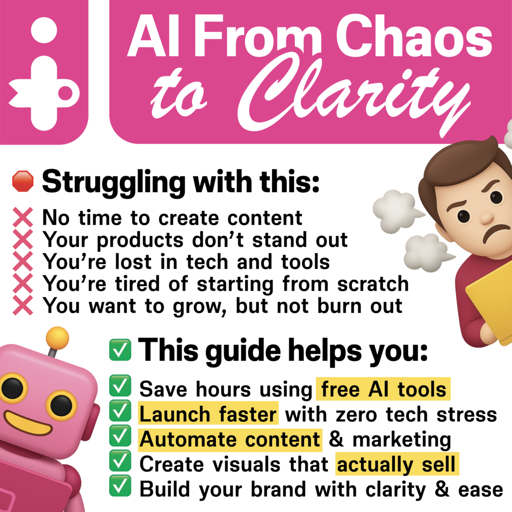 📘Notion Guide: “AI for Smart Creators” 🧠 15+ handpicked free AI tools (with links + use cases) 📚 Use cases for content, visuals, video, Pinterest, website copy 📆 4-week AI Growth Planner 🧠 Prompt Library: 10+ ready-to-use business prompts 🛠️ Notion Template: AI Learning Tracker + Workflow Map ✅ Printable checklists, templates