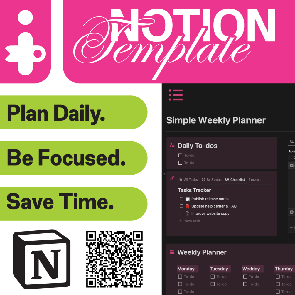 Boost your productivity and stay organized with this Simple Weekly Planner for Notion. Whether you’re a student, freelancer, or busy professional, this free template makes it effortless to plan your days and manage your week in one place.